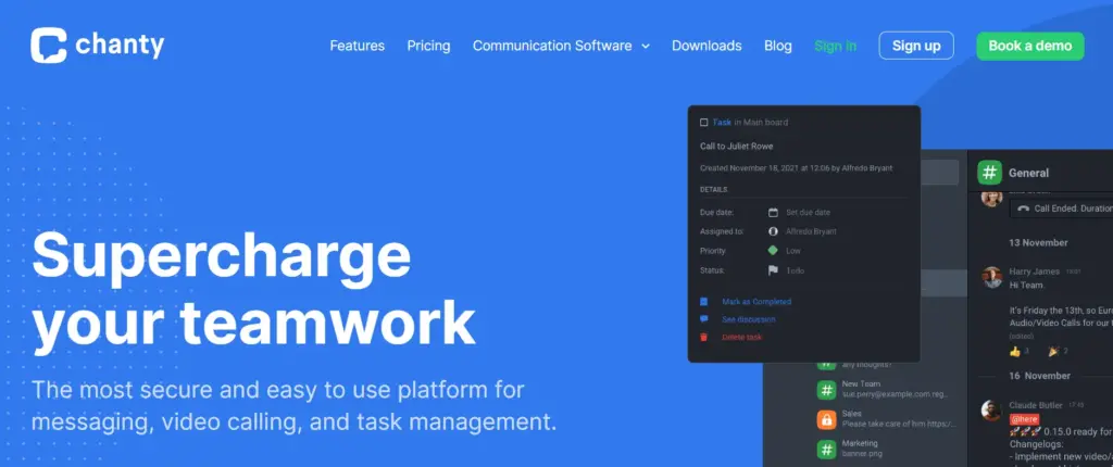 Chanty is a platform for team communication and collaboration that includes messaging, file sharing, and task management. It aims to increase team productivity and streamline workflows by centralizing all communication and collaboration tools.