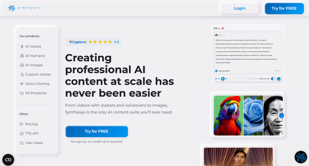 Features: Synthesys offers AI-powered voice generation and video production, making it ideal for creating realistic voiceovers and engaging video content.