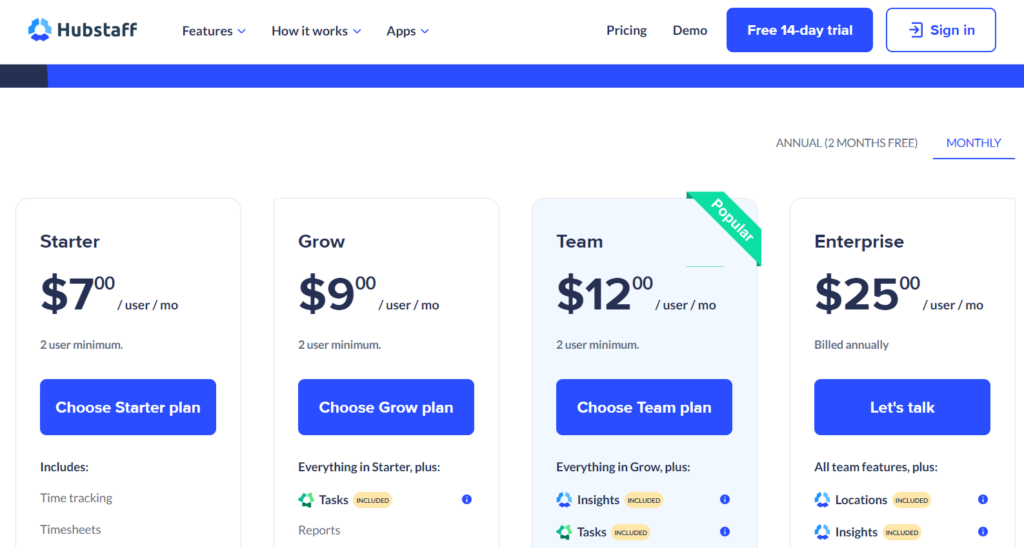 | Time tracking Timesheets Activity levels Limited screenshots Limited app & URL tracking Limited reports Limited payments Clients & Invoices | Everything in Starter, plus: Tasks Reports 1 integration Idle timeout Project budgets Work breaks Expenses | Everything in Grow, plus: Insights Tasks Unlimited screenshots Unlimited app & URL tracking Auto discard idle time Teams Payments & payroll Unlimited integrations Overtime Time off & holidays Scheduling & attendance Client budgets Timesheet approvals Daily & weekly limits | All team features, plus: Locations Insights Tasks Corporate app Higher limits on public API Pay by bank debit (ACH) HIPAA compliance SOC-2 Type II Compliance Enterprise deployment Account provisioning Single sign-on Hubstaff Corporate app |