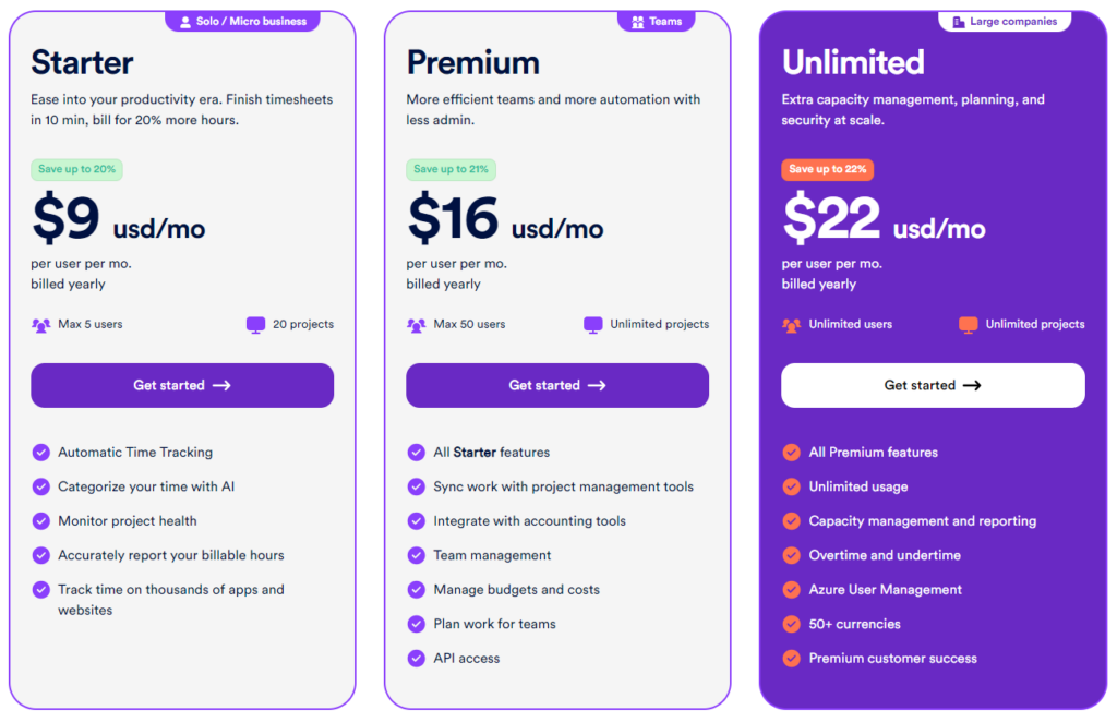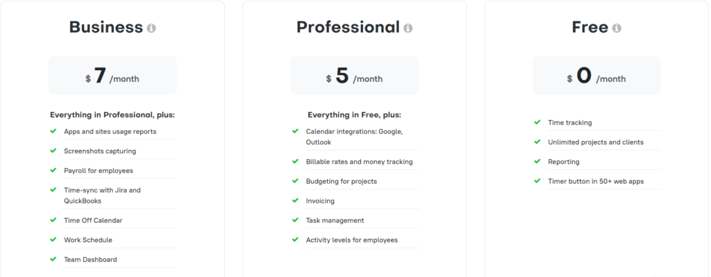 | Basic plan includes: – Unlimited users and groups -Team & individual dashboards – Unlimited projects and tasks – Silent tracking – Unlimited screenshots -Activity tracking – Work-life balance metrics – Basic reporting | Everything in Basic, plus: – Productivity ratings -Break tracking – Inactivity alerts – 60+ integrations – Payroll features – Web & app usage report – Daily email notifications – Real-time email notifications | Everything in Standard, plus: – Video screen recording – Internet connectivity reporting – Client login access – Executive dashboard – Automatic user provisioning – Dedicated account manage |