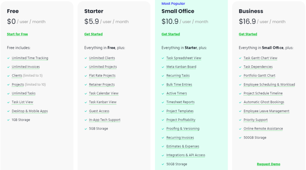 Free Plan – unlimited members, unlimited tasks, meetings, and timesheets, 5MB file attachment, 100 MBs of storage