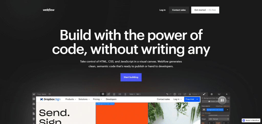 Webflow is a website builder and design tool that is built in the cloud. It lets you make responsive websites without knowing how to code. Its drag-and-drop design makes it easy to make and change websites.