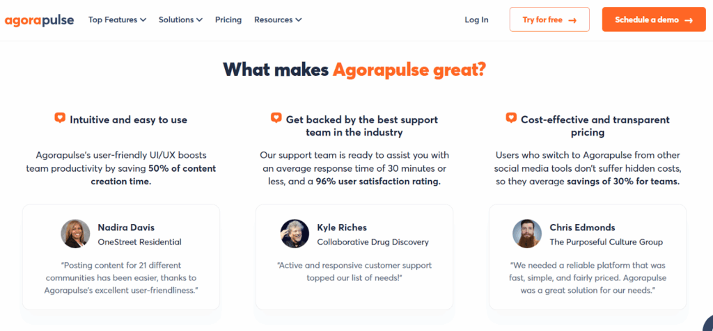 Agorapulse sets itself apart by addressing three major team challenges: fragmented communications, inconsistent workflows, and unclear performance tracking.