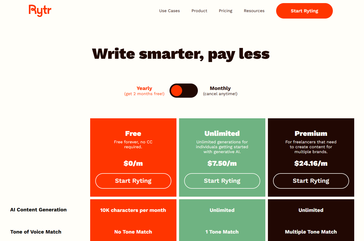 - Rytr’s free ai plan permits content creation with 5,000 characters every month