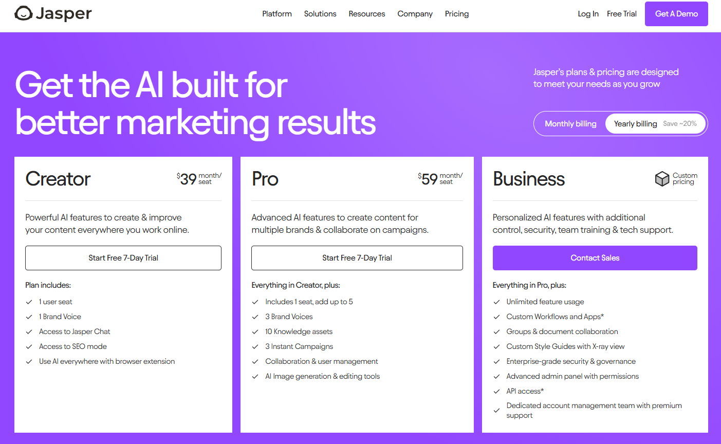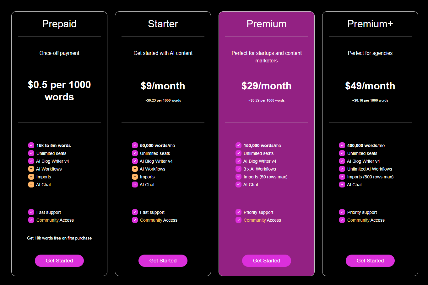 - Starter Plan: $49/month with up to 20,000-word content generated