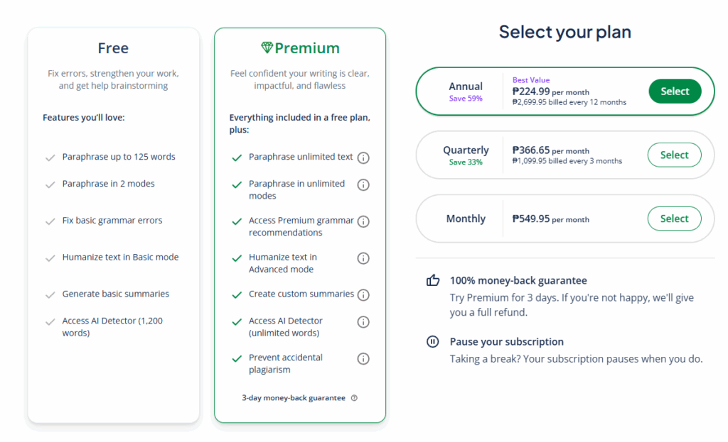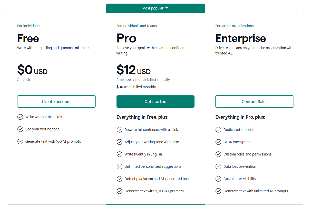- Premium Plan: $12/month for improving writing style, tone including rewriting sentence and paragraph structures