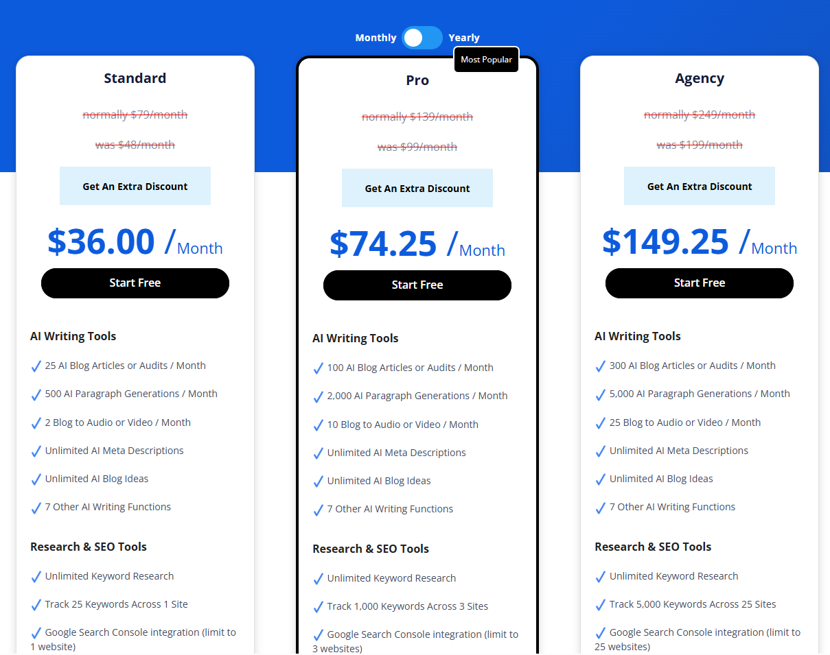 - Premium+ Plan: $99/month with 300 000 words with all the features under the Premium Plan plus two times human-enhanced blog written monthly.
