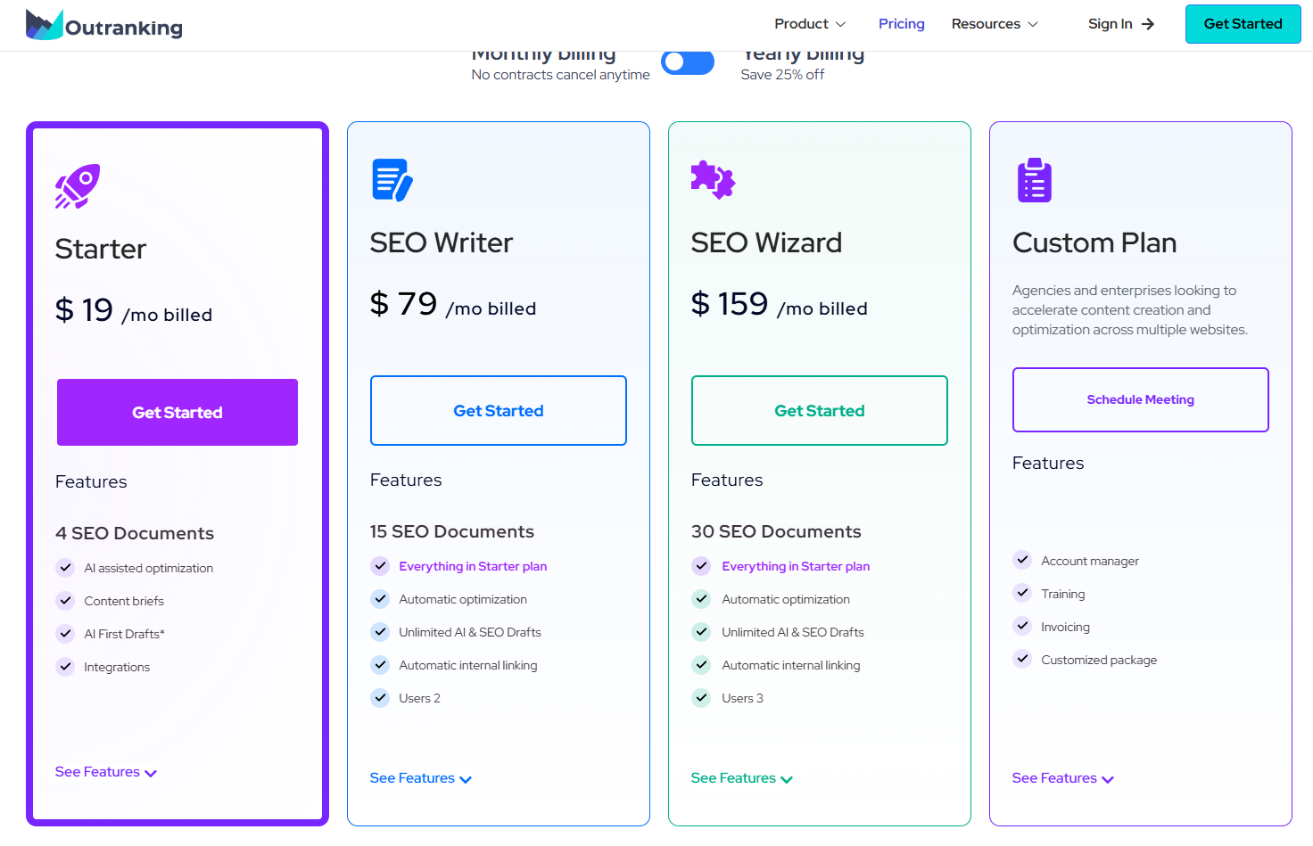 Outranking offers four plans to achieve caliber SEO content as much as you want and need.