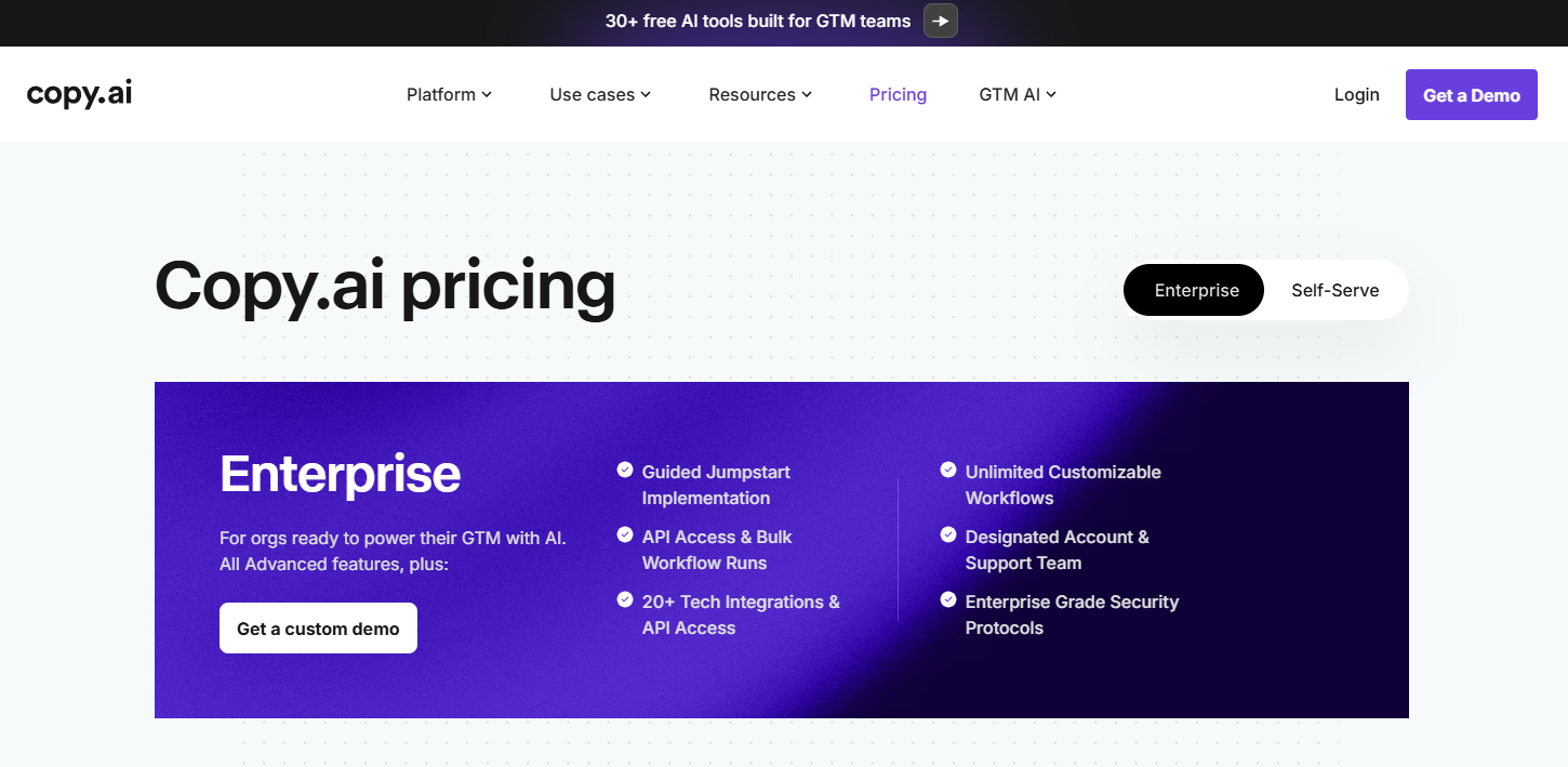 Enterprise plan: Users can choose the ai writing tools they want in CopySmith. They can select from landing pages maker, scalable data export/import, personalized templates, accounts managers, and more. They can also schedule a demo of this plan with the CopySmith server team.