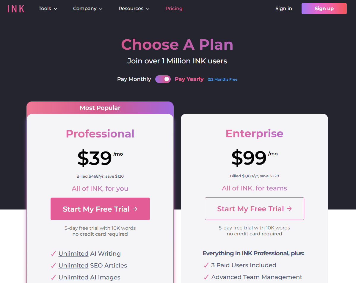 - The INK free version gives complete ai copywriting tools without entering credit card details.