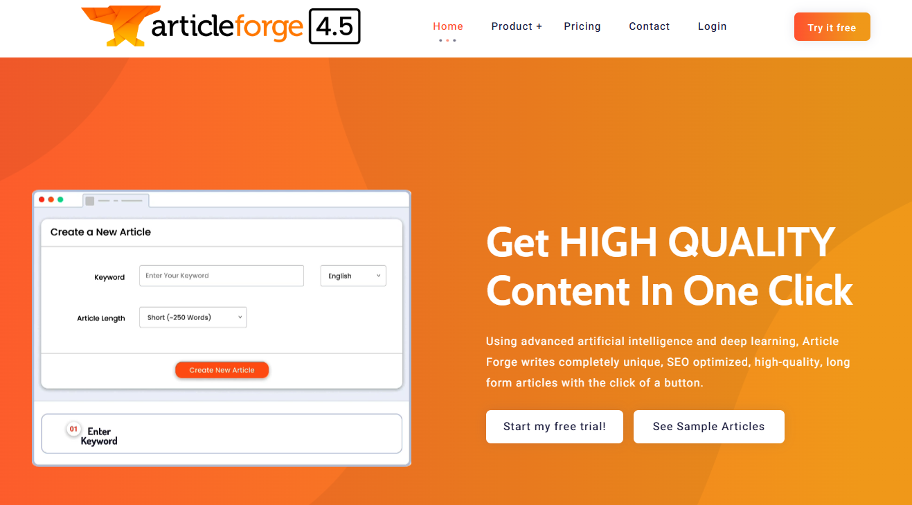 Article Forge creates unique content than most artificial intelligence content generators. Most ai writers only use a single deep learning model, but Article Forge uses eight deep learning models to curate high-quality content.