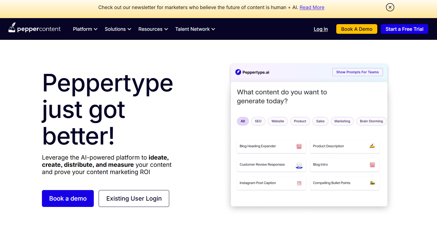 The Peppertype ai writing software combines creator skills with artificial intelligence to help create better content faster.