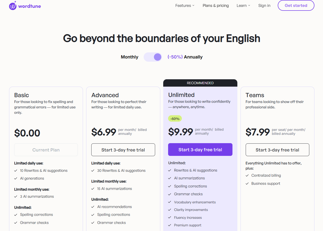 Business plan: $12.50% (Offers unlimited use of ai writing software tools under the premium plan, including the rest of the advanced features)