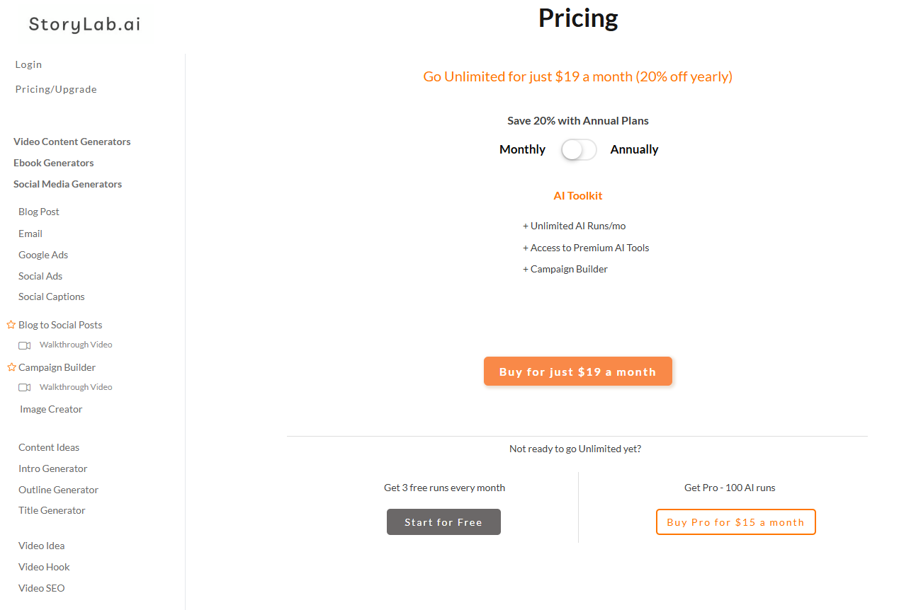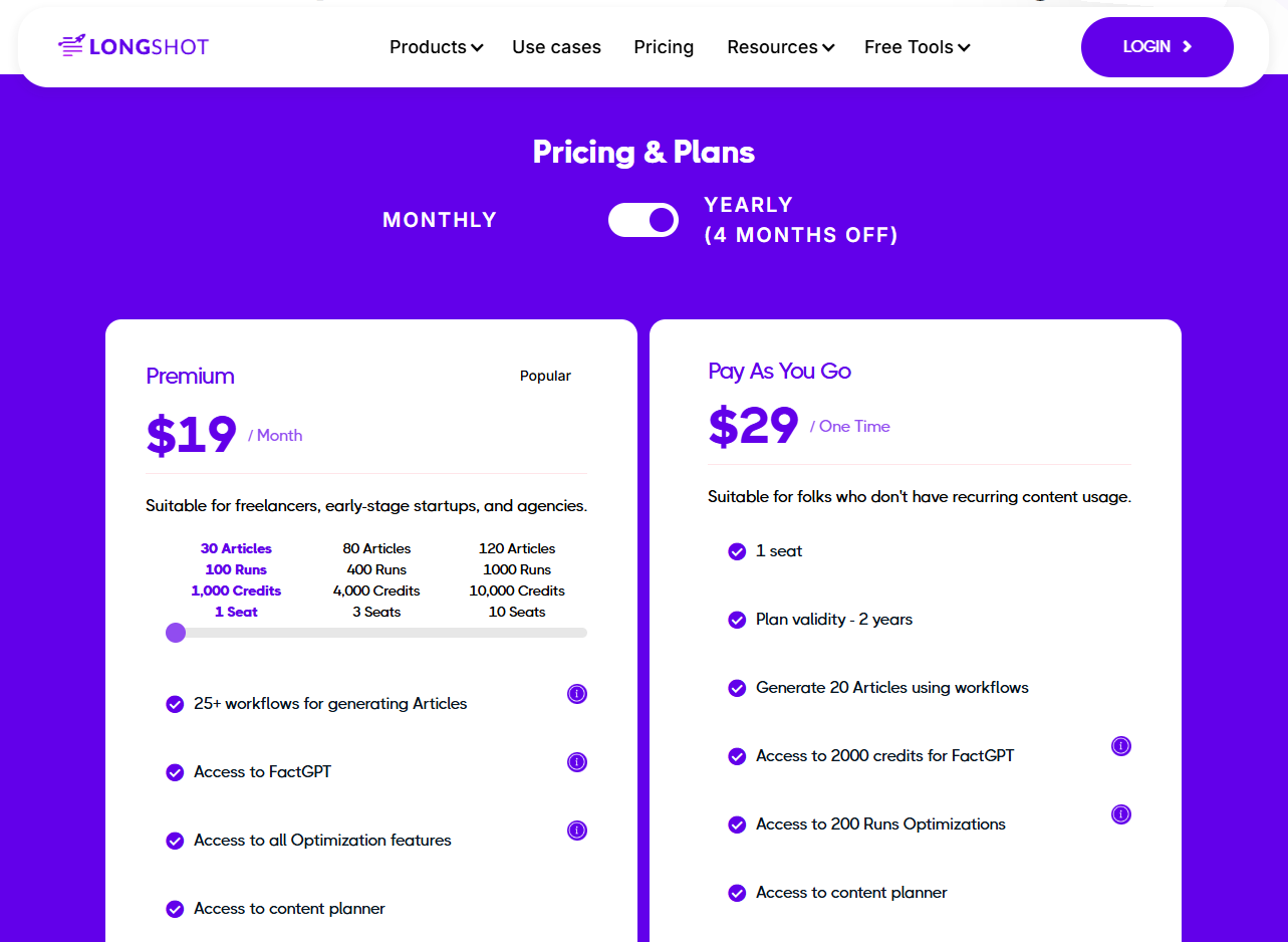 Premium plan: $20 per month or $79 per year access to ai writer and ai copywriting tool.