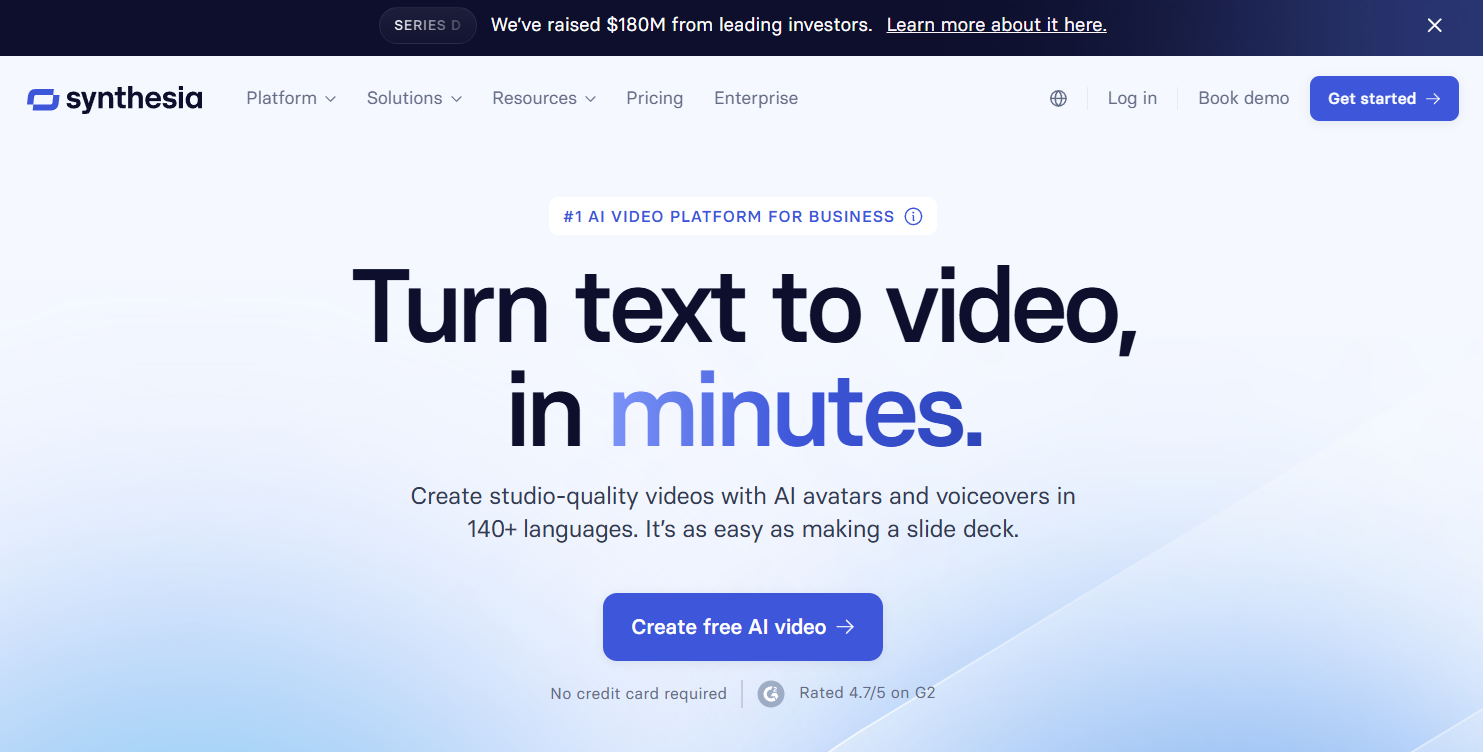 Synthesia is the top-rated platform for AI-powered video creation. Thousands of businesses use it to produce videos in 65 languages, saving up to 80% of their time and money.