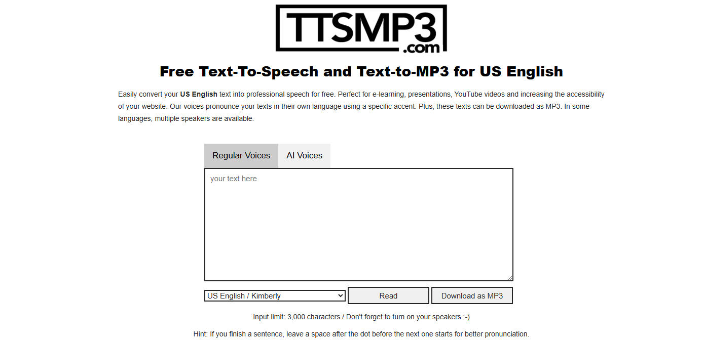 TTSMP3 is a free online Text-to-Speech and Text-to-MP3 conversion service. It supports US English and can be used to convert any text into audio.