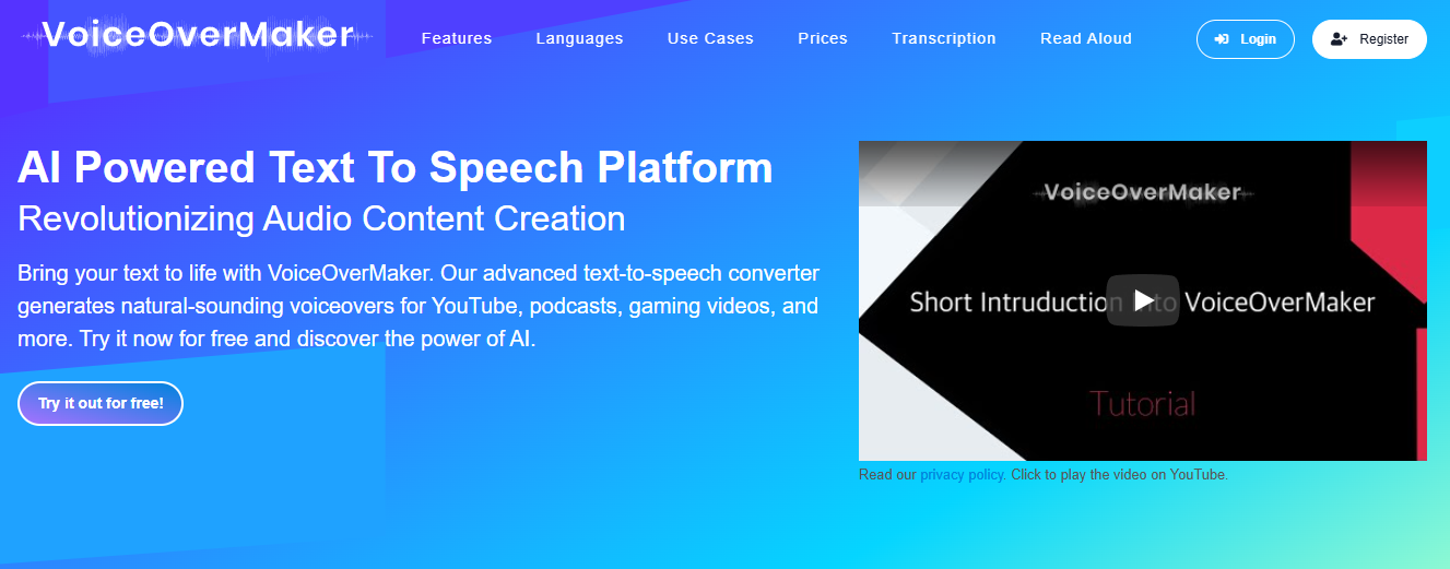VoiceOverMaker is a free online Text-to-Speech converter that enables you to create voice-overs with a natural tone. You can choose from a variety of speaking styles, including female and male voices, as well as a variety of languages.