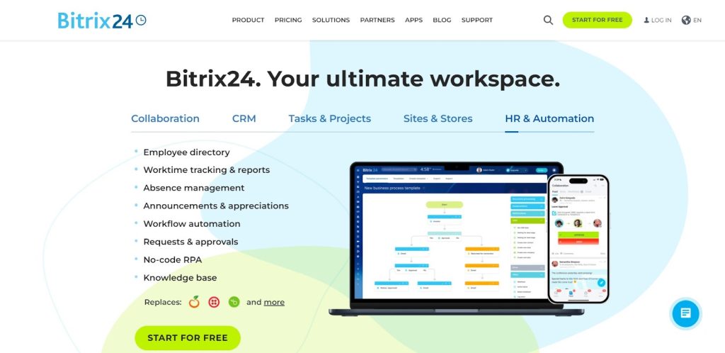 Moreover, Bitrix24 offers a free account option, making its array of tools more accessible. These tools extend to employee management and time tracking, making it an optimal choice for businesses seeking to centralize operations and boost team productivity.