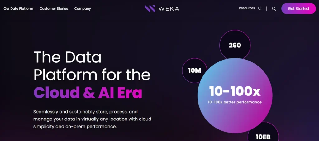 Weka efficiently and durably store, process, and oversee data in a wide range of locations, combining the ease of cloud computing with the performance of on-premises systems. The utilization of cloud-based technology in Weka enables enterprises to effectively handle their data in a streamlined manner while upholding the performance benchmarks commonly associated with on-premises solutions.