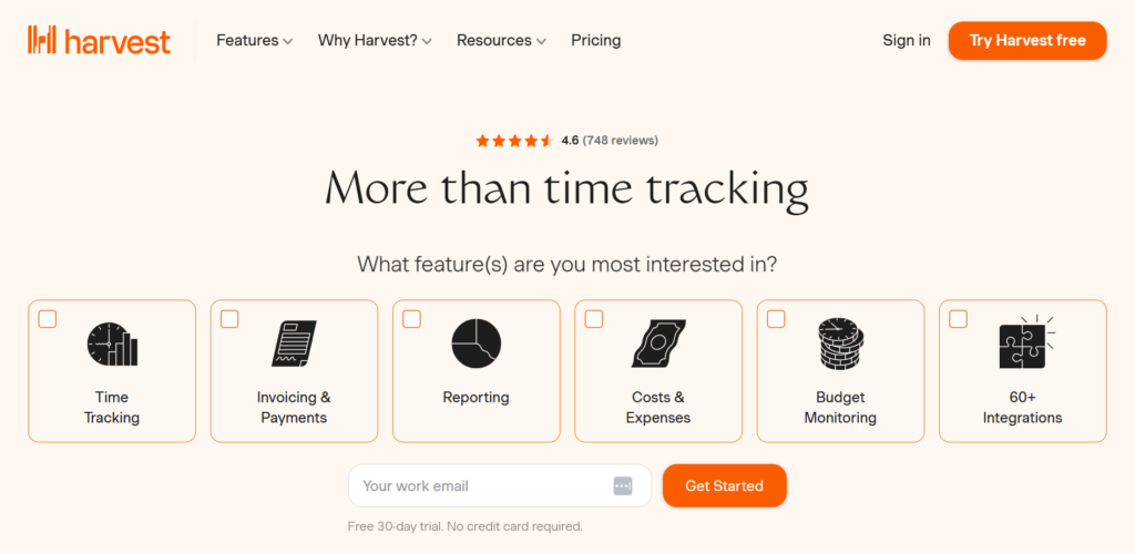 Harvest is a versatile time tracking software known for its easy invoicing and expense management features. Its best feature is the seamless integration with other project management tools, which simplifies the tracking and billing process. This functionality helps teams improve their productivity and ensures accurate billing for clients.