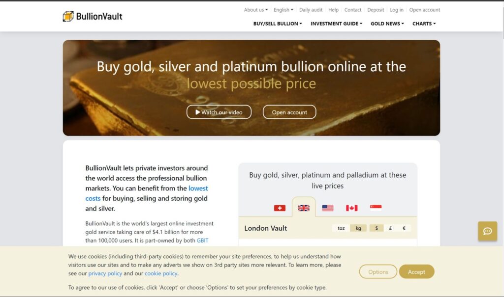 BullionVault caters to investors interested in larger purchases. If you’re looking to buy ounces of silver in bulk, such as 100 oz silver bars, BullionVault offers competitive pricing and secure storage options.