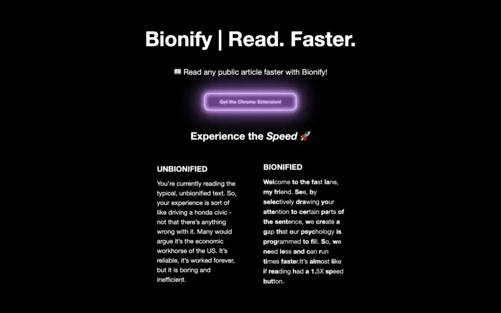 Omoguru is a bionic reading alternative that converts printed text into digital form. Omoguru is an excellent tool for those who have difficulty reading and want to learn how to read better. It can be used by anyone who wants to improve their reading skills, from children learning to adults who wish to learn how to read more fluently.