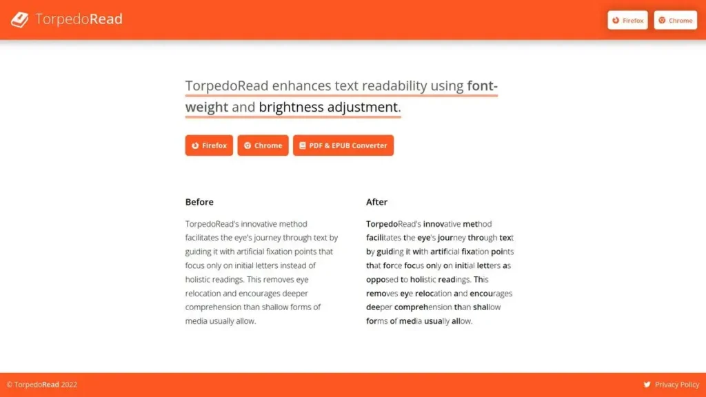 TorpedoRead is a bionic reading app that uses machine learning to help you read more quickly and accurately. The Torpedo team has developed TorpedoRead, a group of Google and Microsoft engineers specializing in artificial intelligence and machine learning. TorpedoRead can help you learn to read faster, easier, and more accurately.