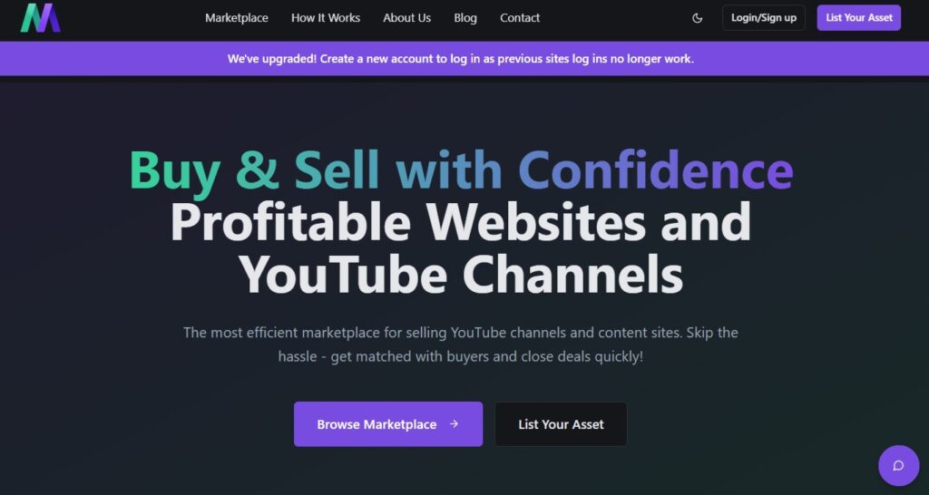 Motion Invest focuses on content/affiliate websites and YouTube channels, with a streamlined, vetted experience. The platform emphasizes quick transactions and transparent pricing.