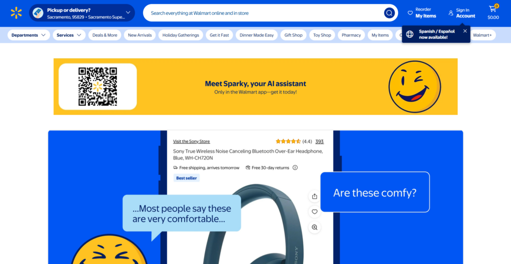Walmart’s GenAI assistant, “Sparky,” is built for multi-turn conversations that mimic a helpful store associate. It shines in occasion-based planning—ask it to “plan a birthday party for 10 kids under $100,” and it will build a cart with food, decor, and supplies while checking for dietary restrictions.