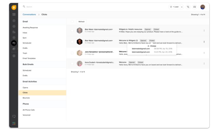 The platform supports two-way email synchronization with popular providers like Gmail and Outlook, ensuring all communications appear in the CRM regardless of where they originate. Chat functionality enables real-time conversations with website visitors, creating immediate lead capture opportunities.