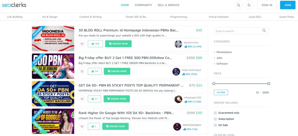 SEOClerk functions as a marketplace where individual sellers offer guest posting packages across various niches and domain authority levels. Pricing varies widely, from low-cost listings under $10 for basic blog placements to several hundred dollars for higher-authority editorial links. The platform requires careful vetting since service quality depends entirely on individual sellers.