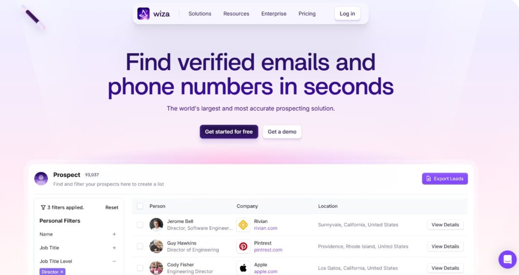 Wiza specializes in LinkedIn contact extraction for building outreach lists focused on content managers and editors. The platform exports verified email addresses directly from LinkedIn searches with high accuracy rates. Wiza uses a credit-based model, with an entry plan starting around $83/month per user (billed annually) and a free tier that includes a limited number of emails and phone numbers each month.