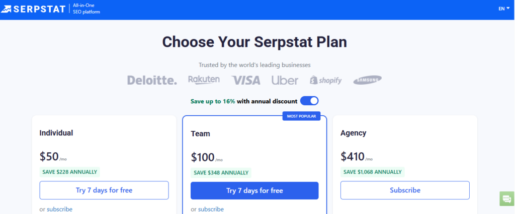 Its pricing varies based on the features and the number of users required. They offer multiple pricing plans to cater to different needs, from individual users to larger teams. Additionally, Serpstat provides a free trial, allowing potential users to test the platform before committing to a paid
