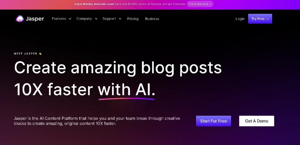 Jasper is a powerful generative AI platform for businesses, allowing teams to create brand-specific content ten times faster, regardless of their digital workflow.