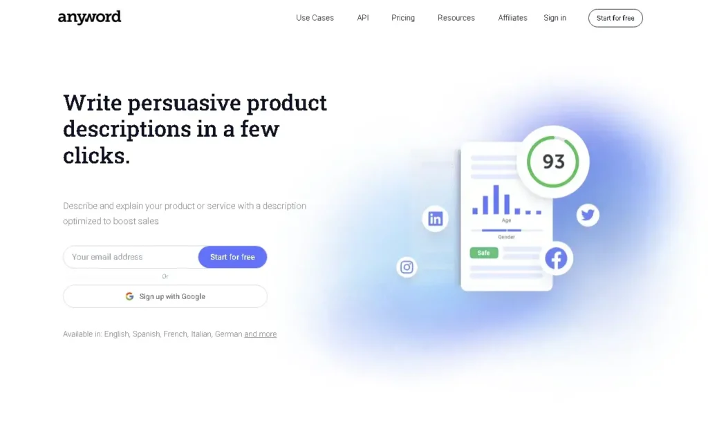 Anyword is an AI-powered tool for generating highly effective content, including meta descriptions optimized for SEO. Designed to create compelling meta descriptions for your web, Anyword’s title generator can also craft optimized page titles. It provides multiple options, allowing users to pick the one that best aligns with their brand voice.