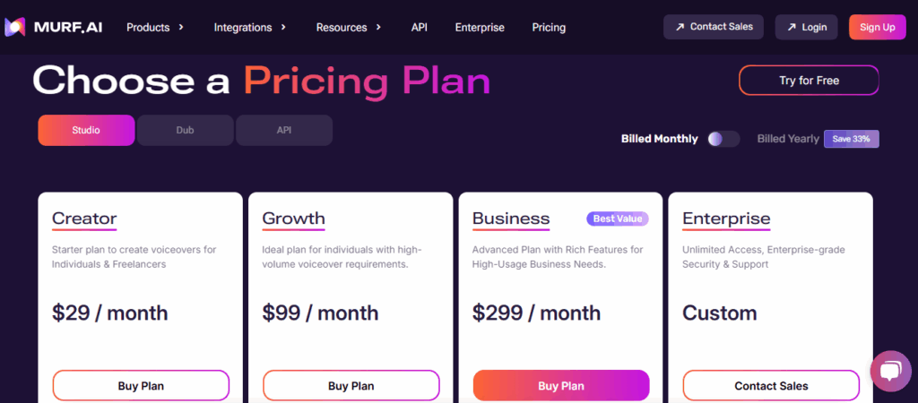 Understanding Murf AI’s pricing structure is essential to deciding which plan suits your needs and budget. Below is a breakdown of available plans, their pricing, and which type of user each is best for: