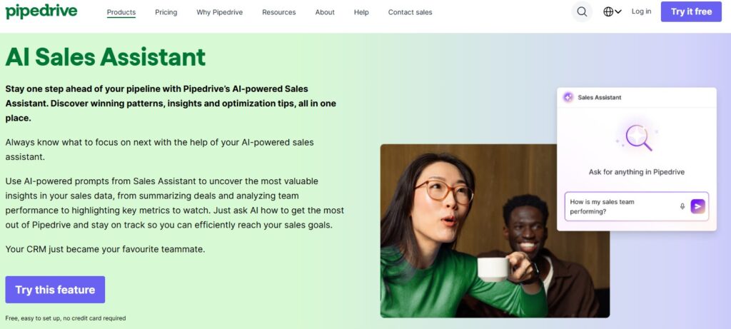 Pipedrive’s AI Sales Assistant focuses on deal closure prediction, next-best-action recommendations, automated lead scoring, and AI-generated emails. It delivers mixed accuracy that depends heavily on data quality and deal complexity, and generally needs at least 90 days of historical data before its predictions become reliable. In internal testing, the assistant performed best on simpler, transactional sales cycles rather than long, multi-stakeholder enterprise deals.