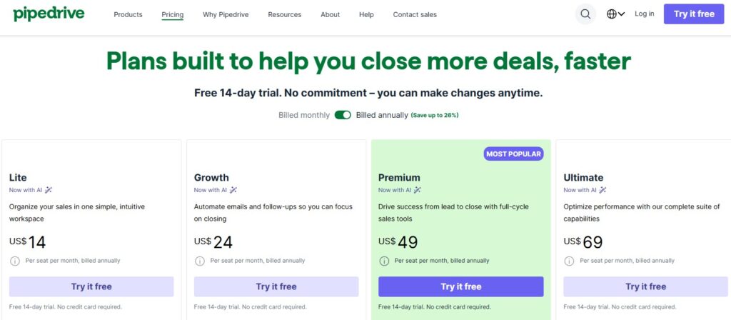 Pipedrive’s paid tiers are priced per user per month, with discounts for annual billing, and are currently organized into multiple levels (such as Lite, Growth, Premium, and Ultimate), with exact plan names and inclusions varying by region and over time