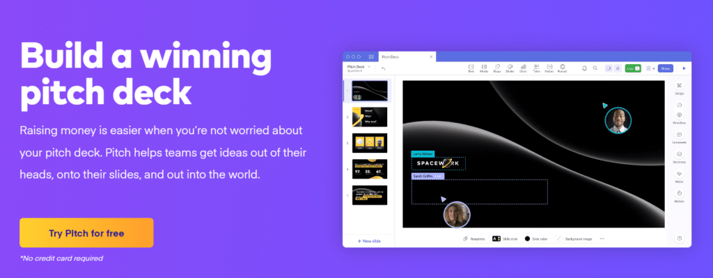 Pitch’s professionally designed templates and intuitive design tools make it easy to create pitch decks. It can effectively communicate your value proposition and capture your audience’s attention. The platform’s real-time collaboration features allow your team to work together to fine-tune the deck.