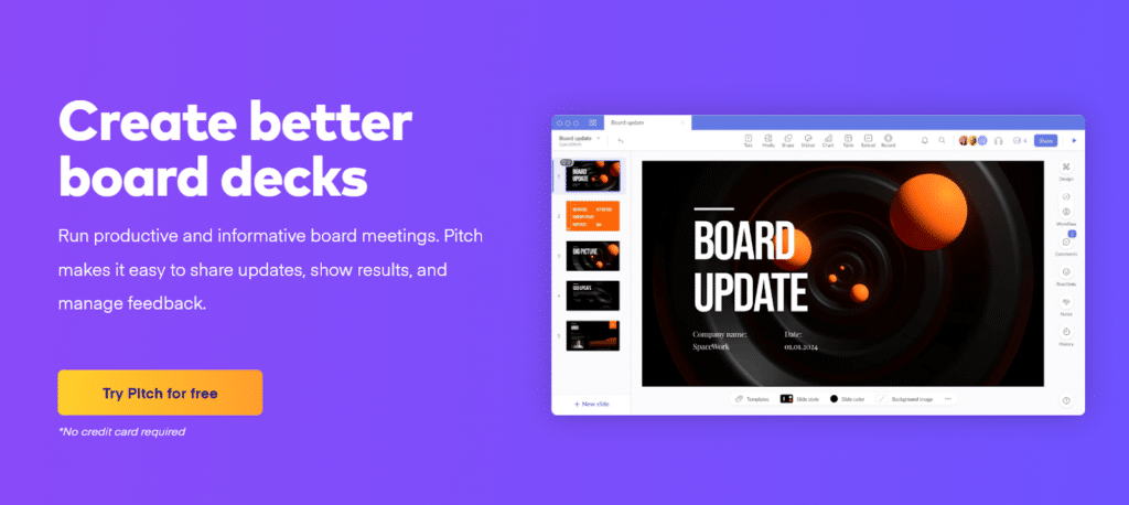 Pitch allows you to create board decks that effectively communicate your company’s performance, strategy, and vision. The platform’s robust security and privacy features protect sensitive information. At the same time, its analytics capabilities can help you gauge the board members’ engagement with your presentation, allowing you to fine-tune your approach for future meetings.