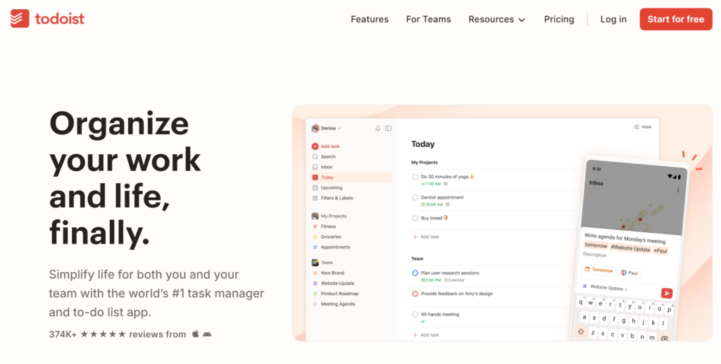 Todoist is your go-to task manager for work, keeping everything organized in one place. With its intuitive interface, setting priorities, and deadlines, and collaborating with team members is a breeze. You can stay on top of your professional game with this handy tool.
