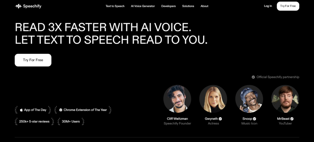 Speechify is a text-to-speech software that converts written text into natural-sounding speech. It’s designed for accessibility, helping users read and listen simultaneously. With AI voice technology, Speechify offers high-quality, human-like voices for personal and professional use.