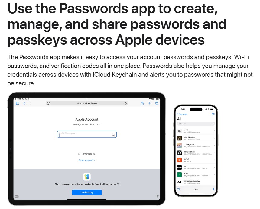 • Apple TV: Uses your iCloud Keychain credentials for sign‑in via Settings > Users and Accounts > Passwords, but management options are limited compared to iPhone, iPad, or Mac.