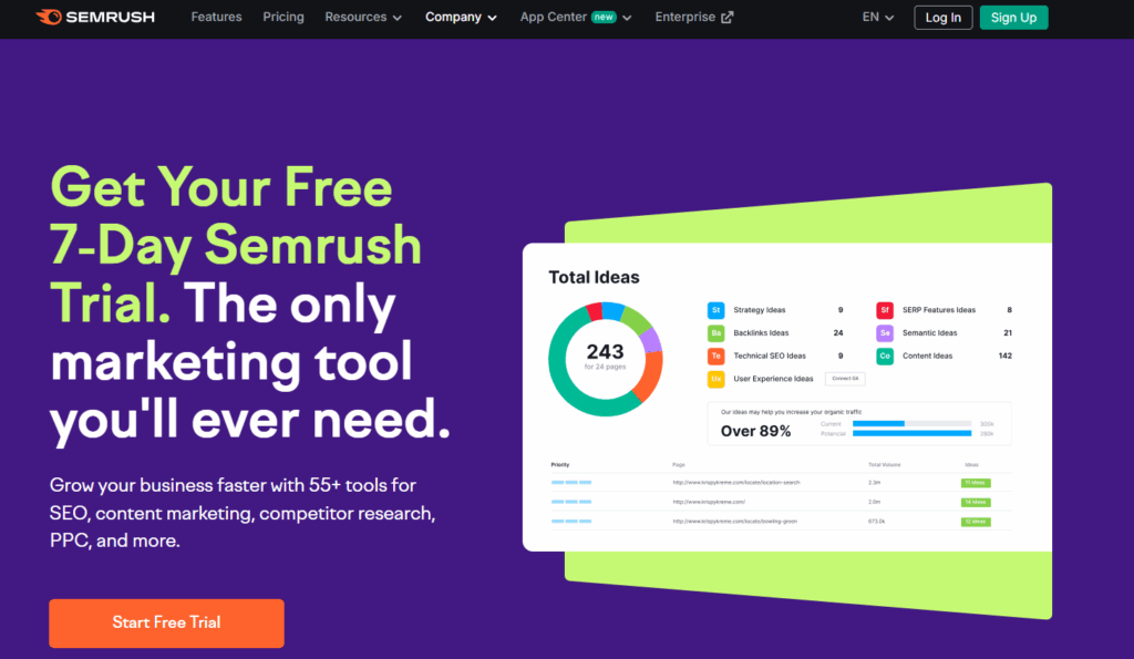 - The SEMrush free trial gives you full access to powerful tools, such as keyword research, site audits, and competitive analysis, to optimize your digital marketing efforts.