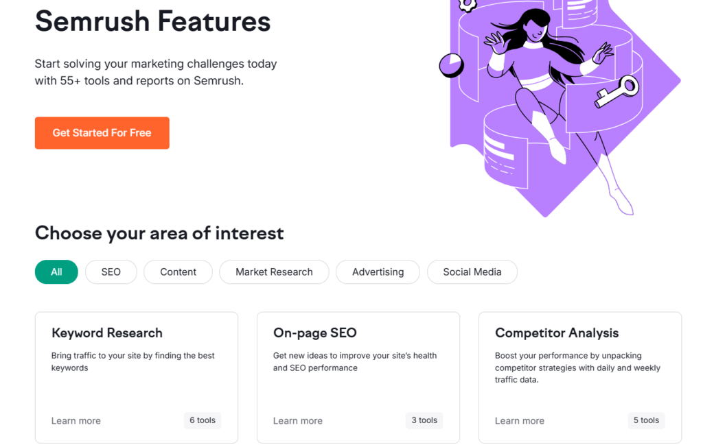 This section highlights the key SEMrush tools you should try during your trial. These tools will help you understand your website’s performance, analyze competitors, and improve your SEO and marketing strategies.