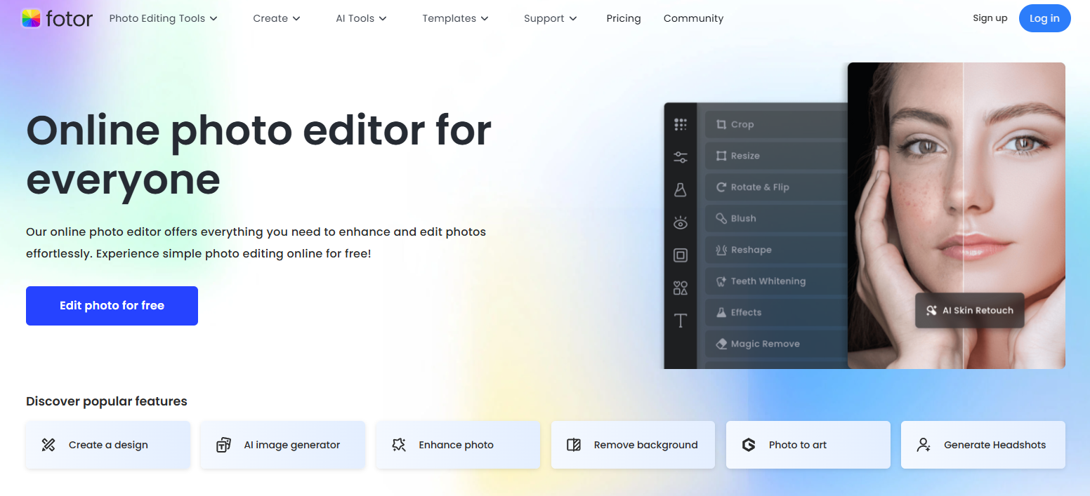 Fotor's photo editor lets you edit photos in just a few clicks. It covers various free online photo editing tools, so you can crop images, resize images
