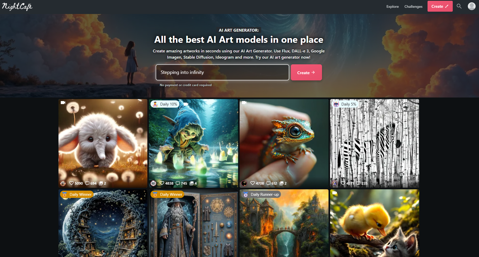 NightCafe takes words as input and generates images based on that text prompt. It’s a unique art generator and offers a new way to create different models and creative word combinations tools. People knew about it for having more features and algorithms than other generators. Yet, it is also quite simple and fun for beginners to understand. Although NightCafe has a credit system, there are many ways to earn points by contributing to the community, or you can buying credits.