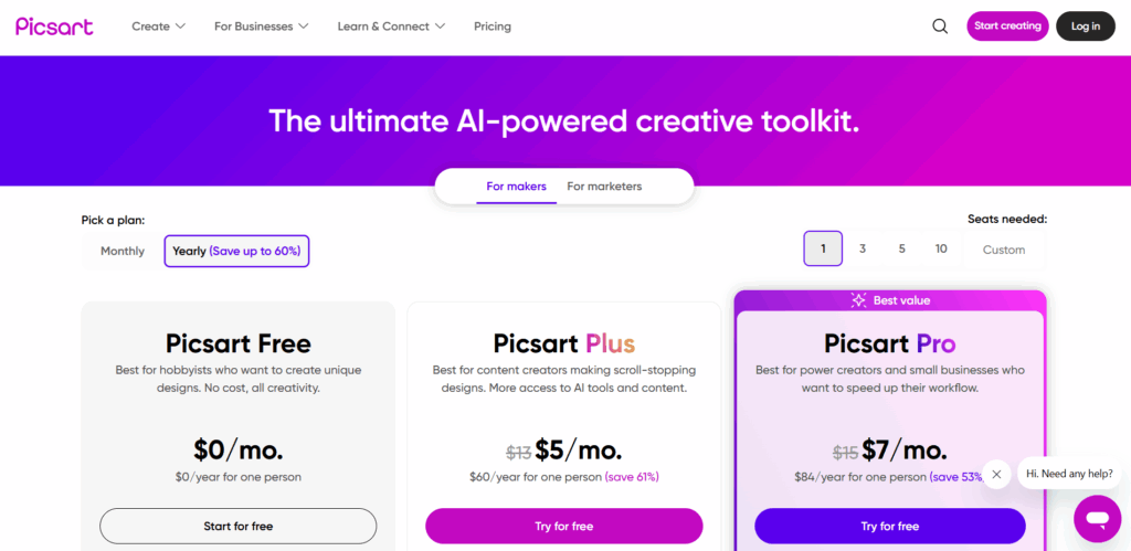 Picsart’s free plan gives you standard editing plus a pixelate/8-bit look, making it a useful AI design studio and AI-assisted writing companion when paired with templates. It even includes a weekly allotment of AI credits for quick effects. Paid tiers unlock more templates, assets, and AI tools (e.g., Plus/Pro), so hobbyists can stay free while power users scale up.