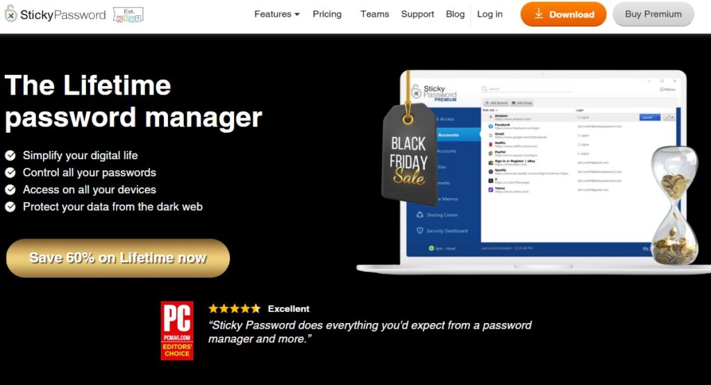 | Sticky Password | Yes | $29.99/year Premium; $149.99 lifetime | Unlimited (paid) | Yes | Yes (dark web monitoring in Premium) |