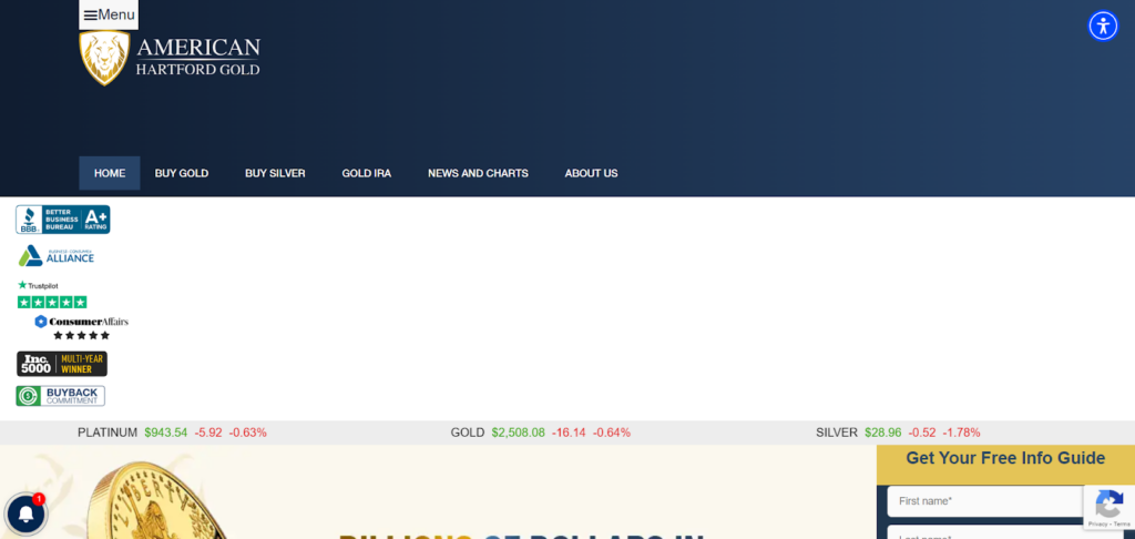 American Hartford Gold is a top-rated dealer in gold, silver, and other precious metals. They specialize in helping individuals invest in gold bullion, silver bars, and gold coins. With a focus on protecting wealth, they offer a variety of bullion products online. Their platform provides market updates and live spot prices.